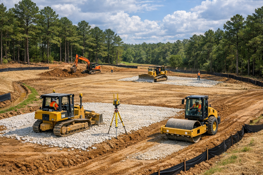 Cut and fill work is also the stage where we address soil types. East Texas soils range from sandy loams to heavy, expansive clays. If the native material is not suitable for supporting a residential foundation pad, we may need to import select fill—engineered base material such as crushed limestone or stabilized clay—to build a more reliable pad. This decision is informed by geotechnical data and, when required, laboratory analysis of the on-site soil.